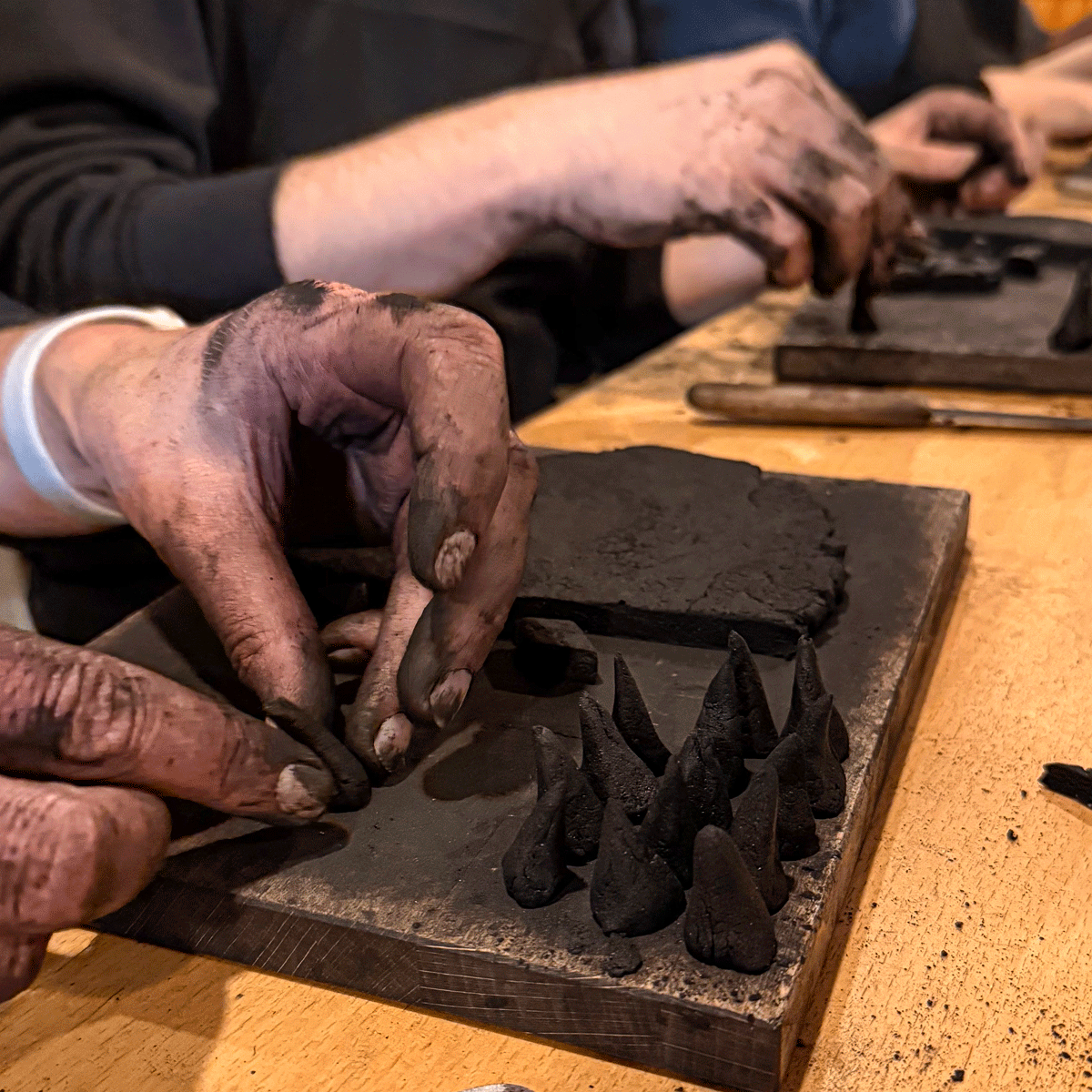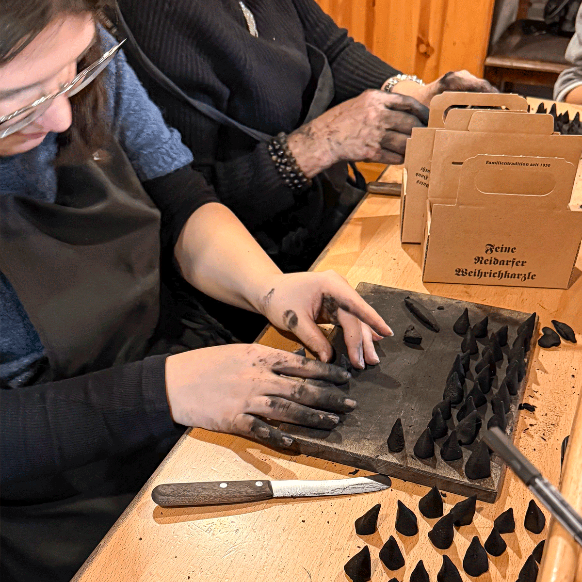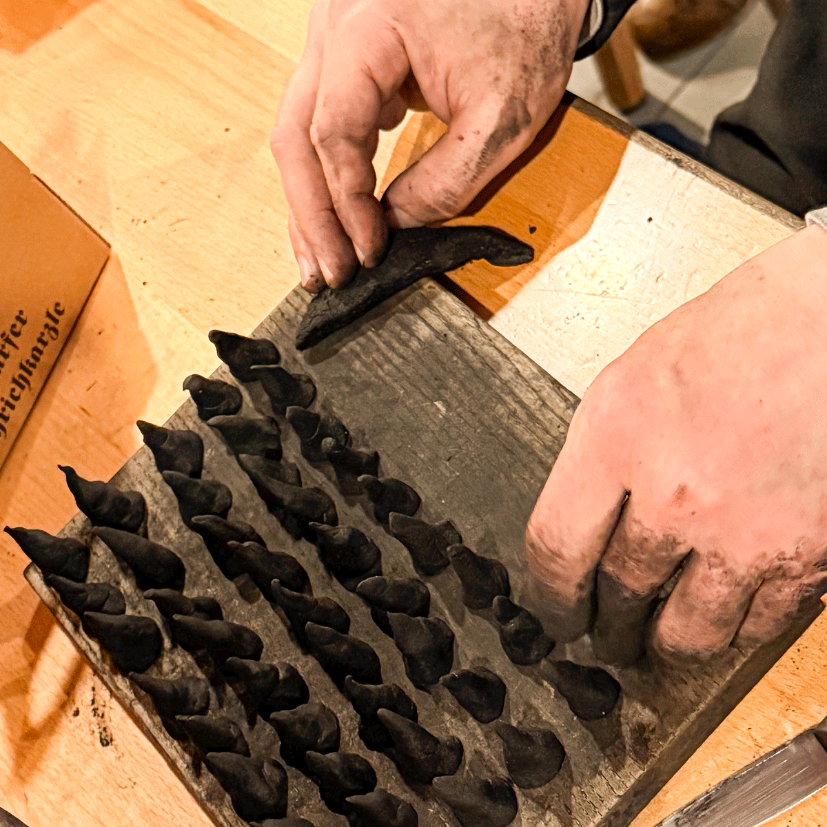 Der Teig wird ausgerollt und in kleine Dreiecke geschnitten. Aus jedem davon wird eine kleine Räucherkerze gerollt: ein schwarzer Wald von Zipfelmützen – dicke, dünne, stumpfe, spitze, schiefe, gerade Karzl. Noch ganz feucht und weich kommen sie in Boxen zum Trocknen.