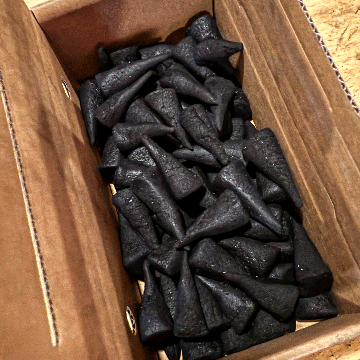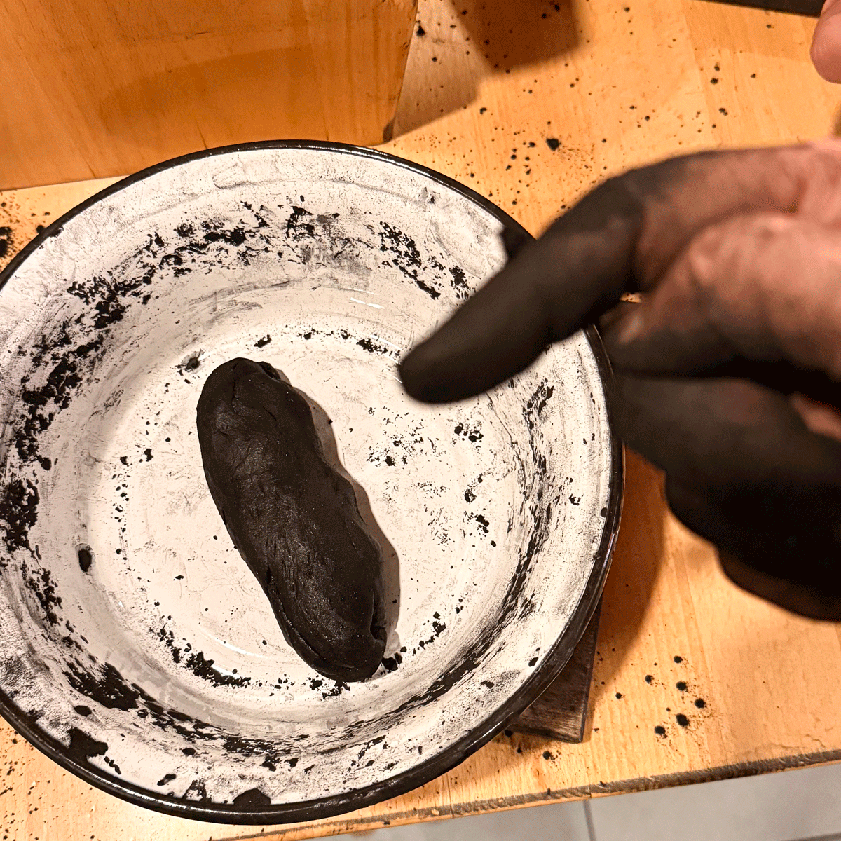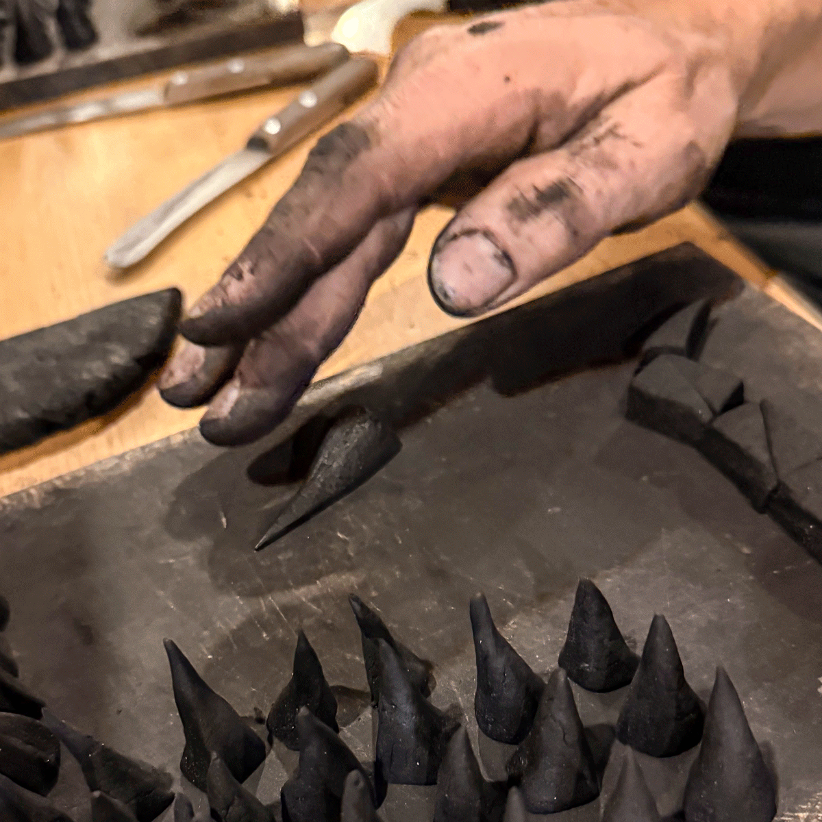 Der Teig wird ausgerollt und in kleine Dreiecke geschnitten. Aus jedem davon wird eine kleine Räucherkerze gerollt: ein schwarzer Wald von Zipfelmützen – dicke, dünne, stumpfe, spitze, schiefe, gerade Karzl. Noch ganz feucht und weich kommen sie in Boxen zum Trocknen.
