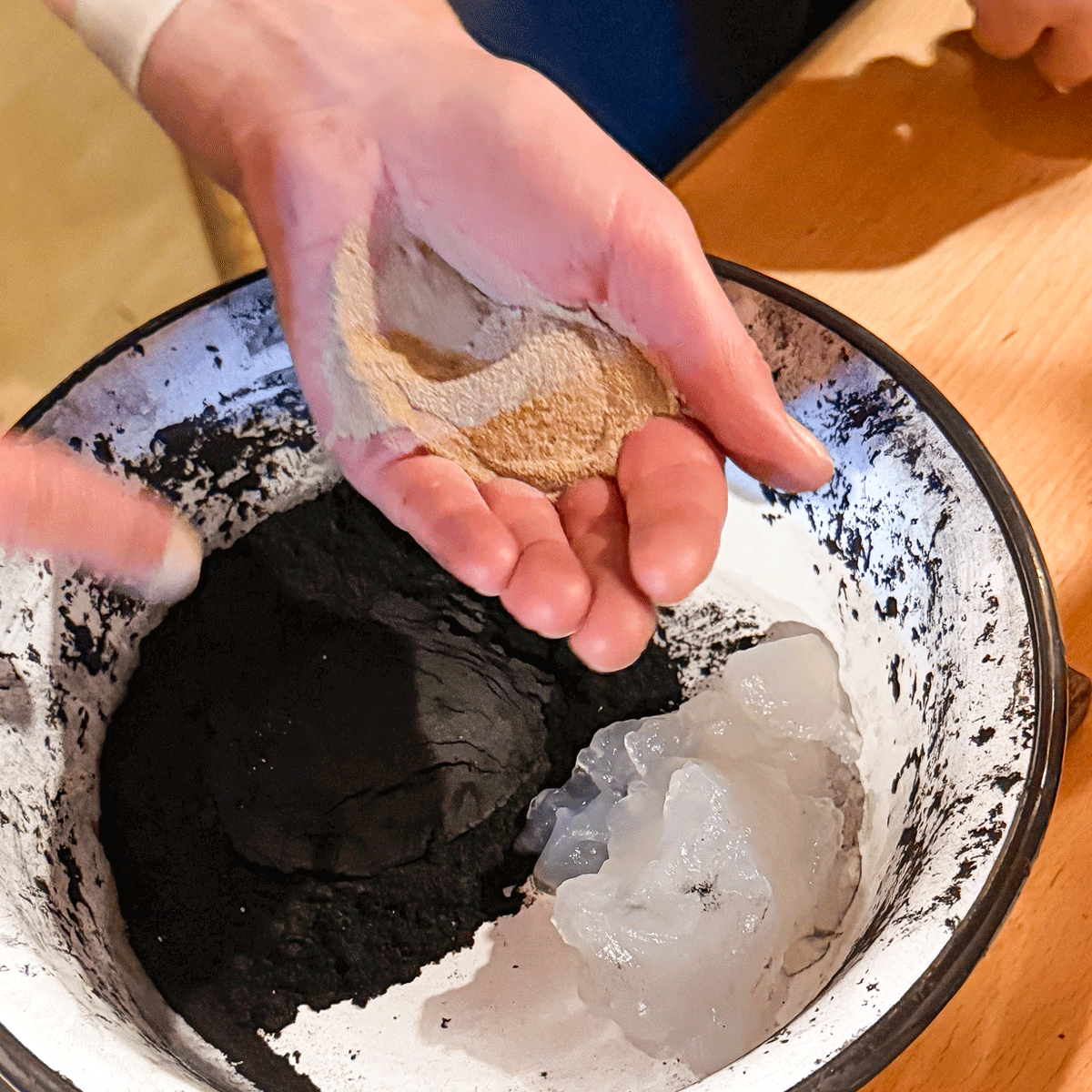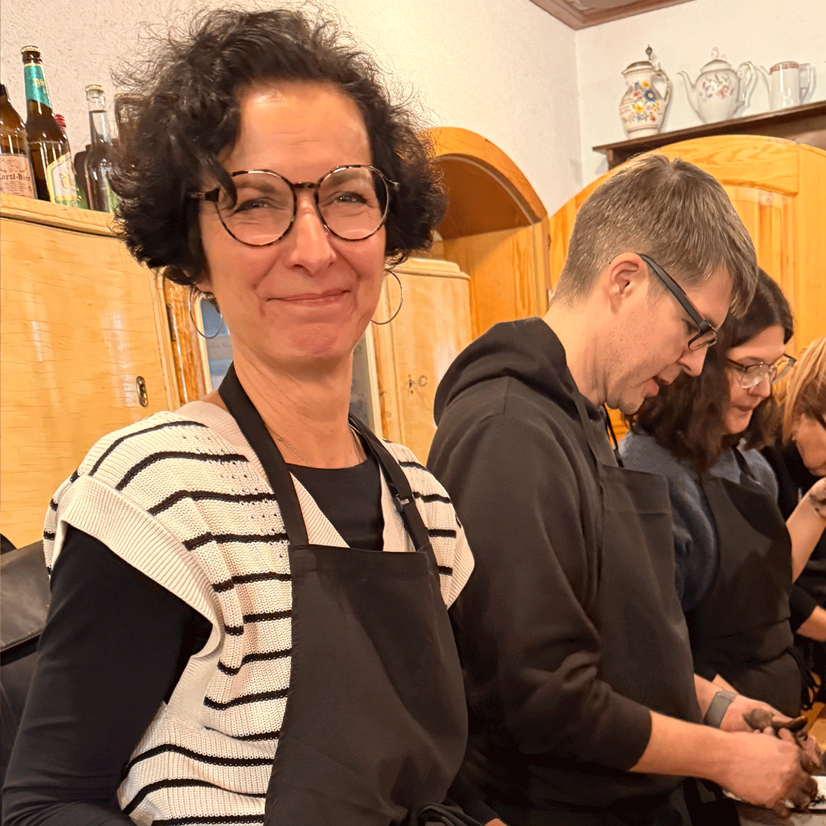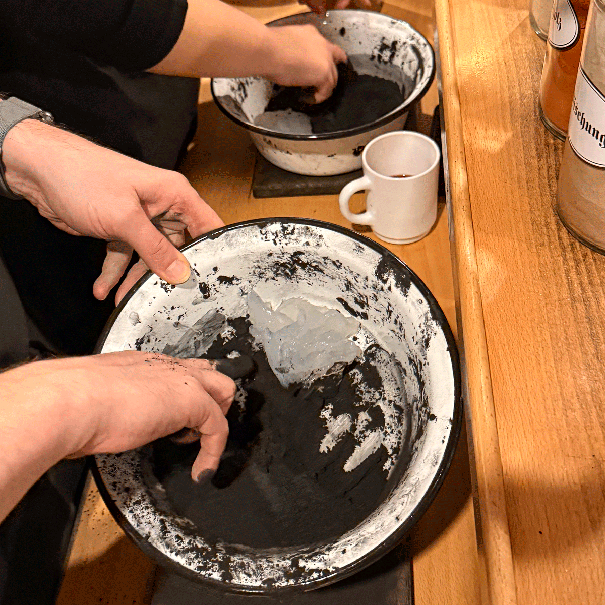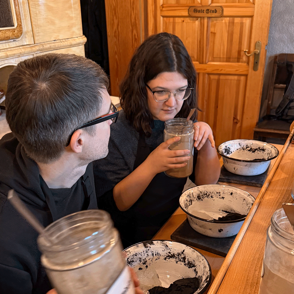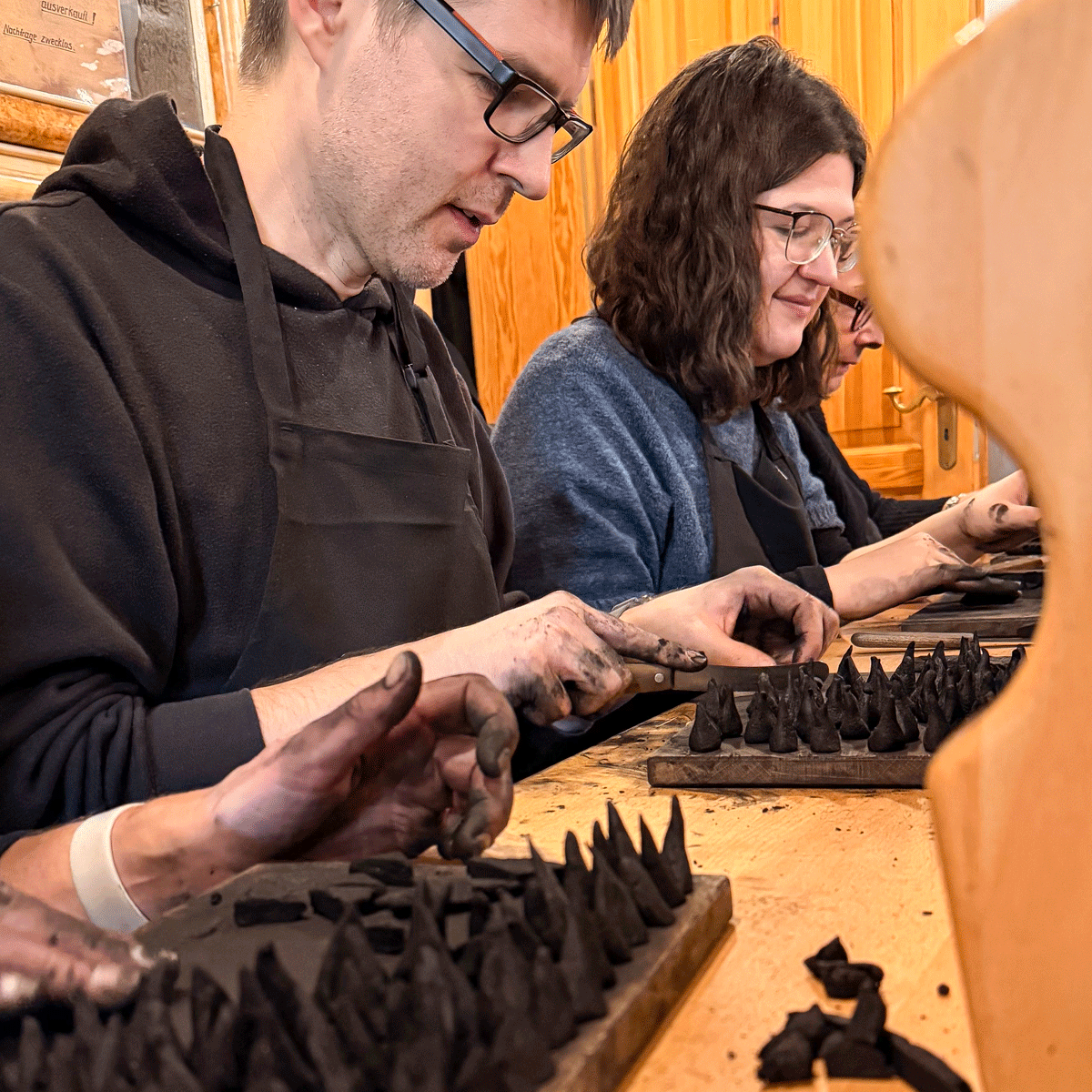 In der urigen Werkstatt des traditionellen Unternehmens Huss lauschen wir dem Vortrag in feinster erzgebirgischer Mundart zur Herstellung der Räucherkerzen. Dann ensteht aus fein gemahlener Buchen-Holzkohle, Kartoffelstärke, Weihrauch, Benzoe und Vanillezucker ein Teigklumpen.